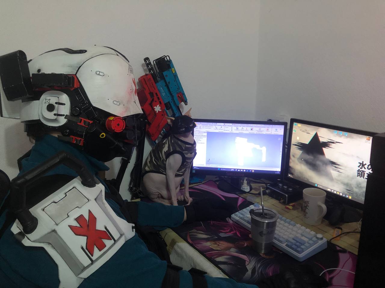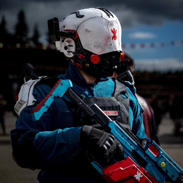 «На данный момент наша гордость - первый масштабный проект. Это костюм персонажа из популярной игры. Была проделана очень большая работа и вложено очень много сил и души. Мы старались сделать реалистичный красивый и, самое главное, удобный костюм. К примеру, в шлем встроили активные наушники, которые глушат громкие звуки и усиливают тихие, что позволяет хорошо слышать в шлеме».
