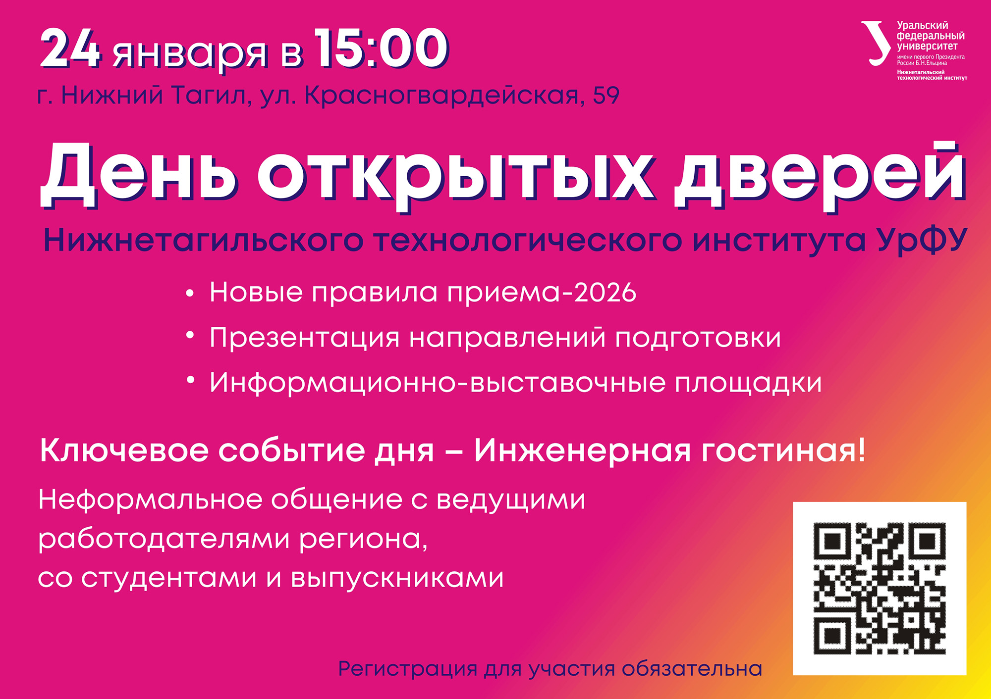Нижнетагильский технологический институт Уральского федерального университета приглашает будущих абитуриентов, родителей и педагогов на День открытых дверей, который состоится 24 января 2026 года с 15:00.