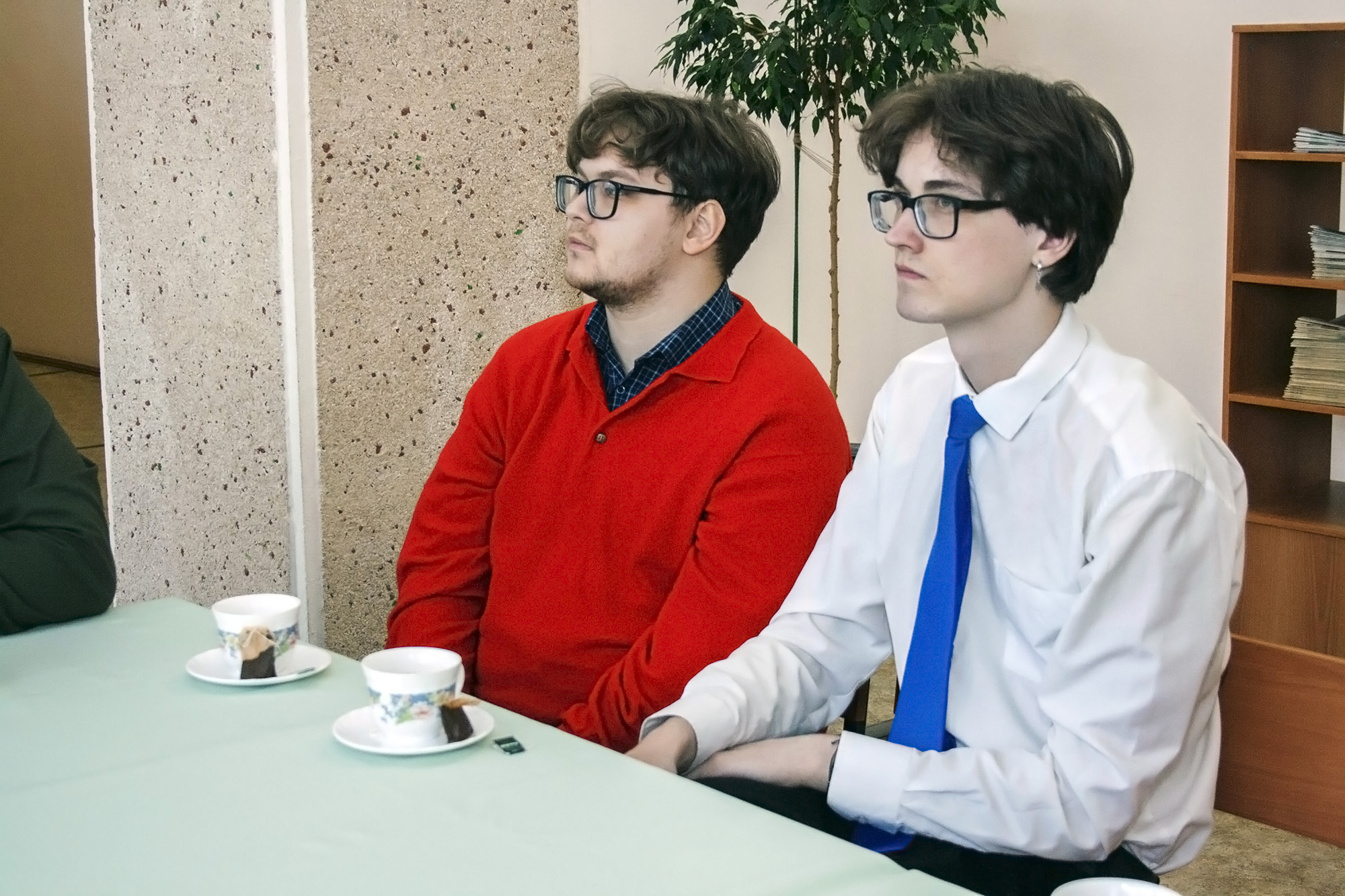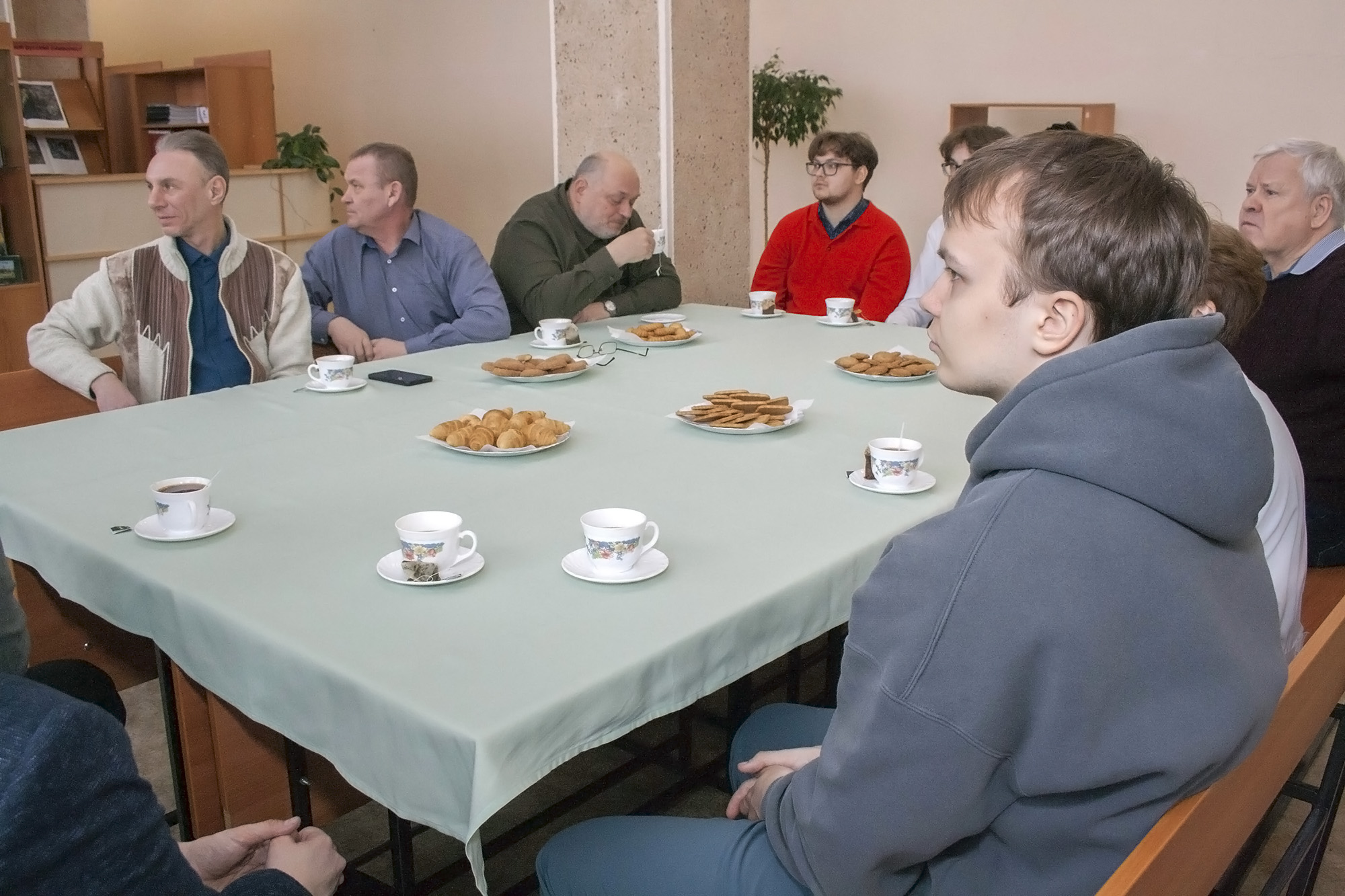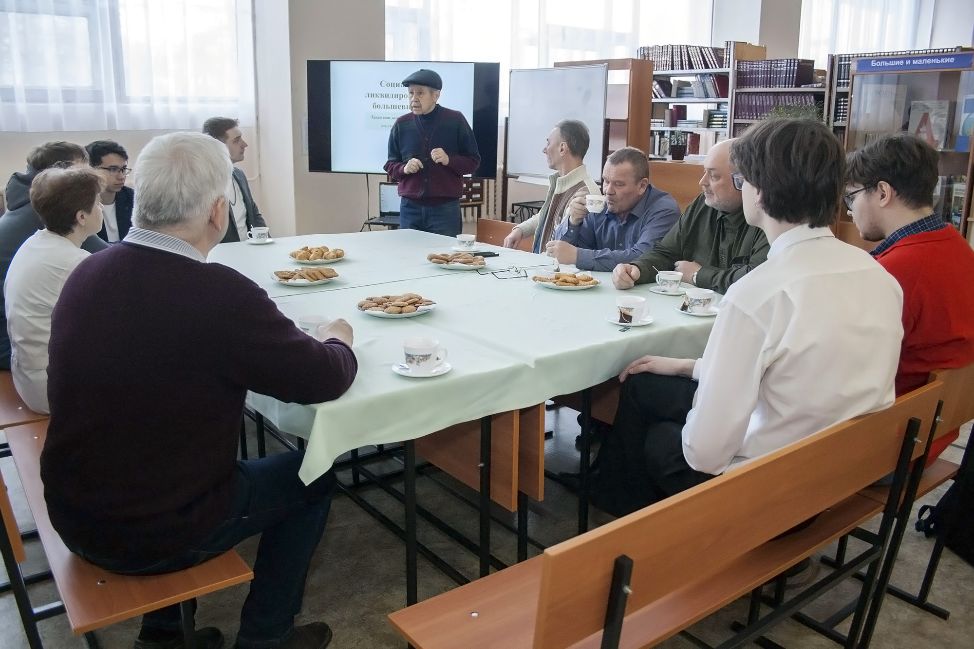 Уютный читальный зал библиотеки института, встреча с ветераном НТИ УрФУ профессором, доктором технических наук Владимиром Александровичем Коротковым.
